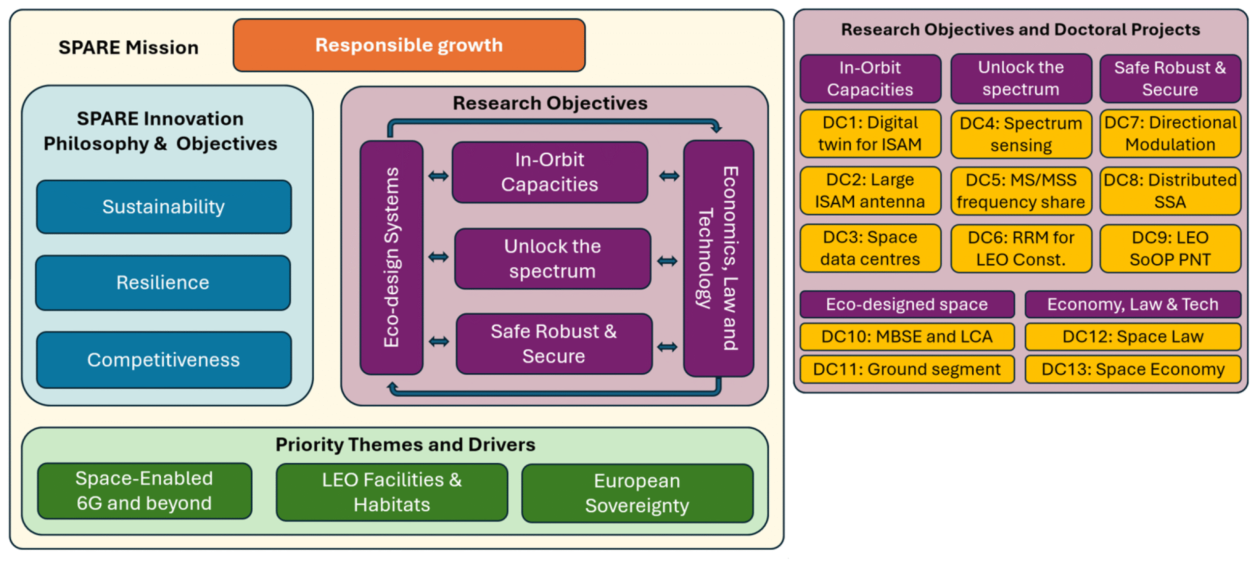 Humanity is presently at the brink of a new era in space development likely to irreversibly bind our daily lives to assets in orbit and beyond. Starting from the paradigm of 6G wireless networks that in the next decade will release cellular services from spaceborne base stations, a diverse range of sectors including energy, materials, nano, bio and pharma will extend activities into LEO orbit. Space is thus evolving into an ever-greater strategic priority for the European society, economy, security and sovereignty. Despite World-class capacities that Europe enjoys, current trends present substantial threats for the future. Current practice poses unviable burden on the terrestrial and orbital environments. Competition from established and emerging players threatens the European position, whilst ease of access is turning space into an increasingly contested domain. The vision of SPARE is to underpin Responsible Growth for space along three interconnected innovation objectives: